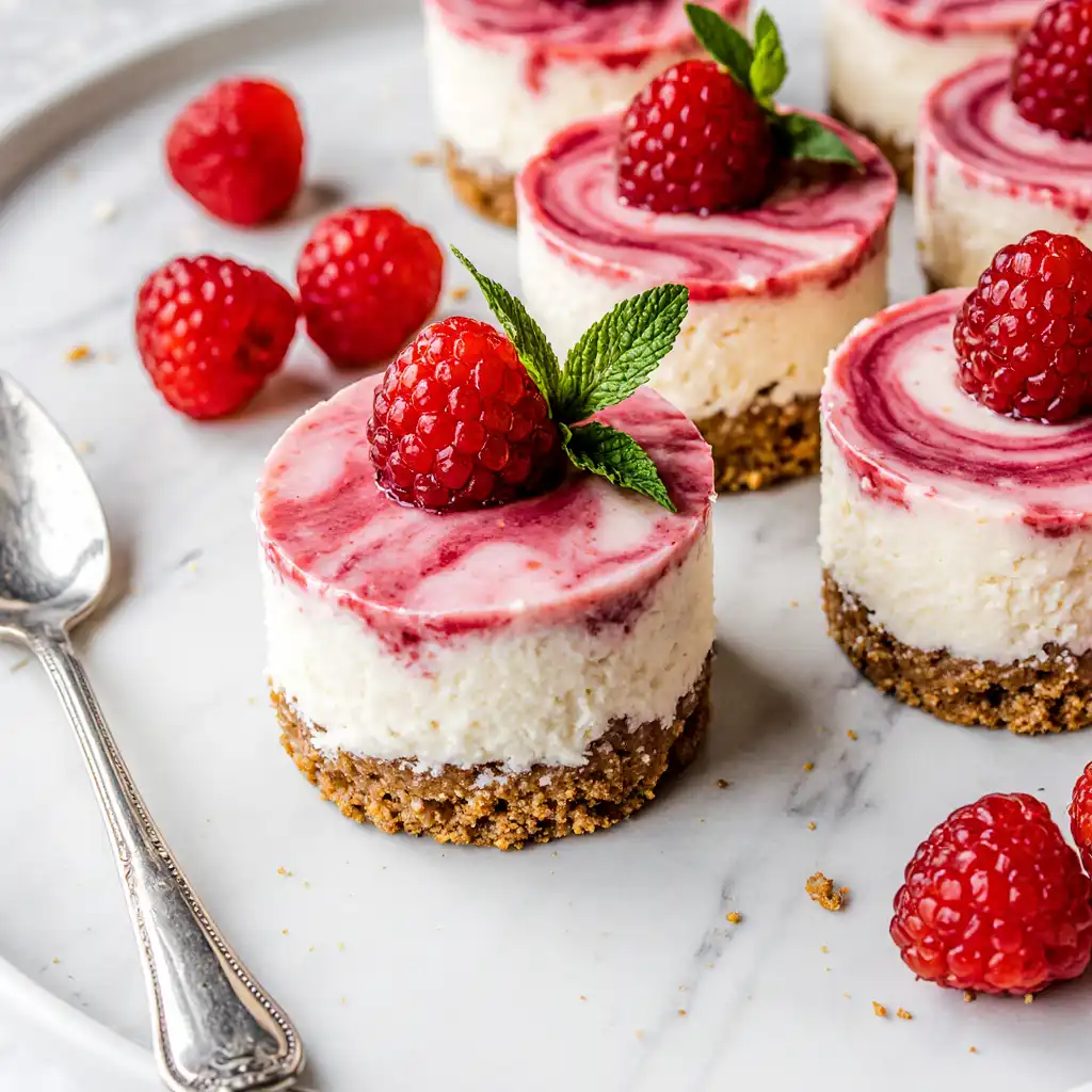 - The Swirl: Drop 2-3 small dots of raspberry sauce on top of each cheesecake. Use a toothpick to gently swirl the sauce into the filling for a decorative effect.